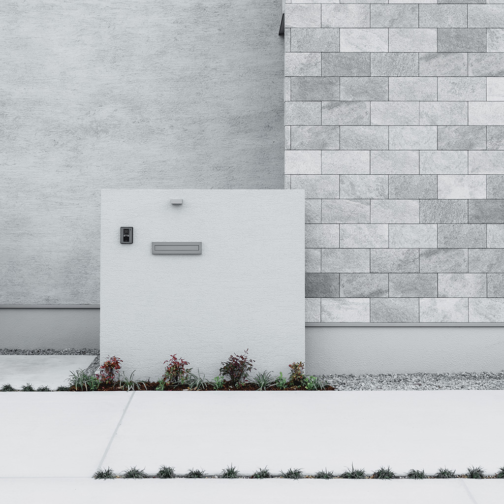洗練されたグレーの外壁とナチュラルストーンが織りなす、モダンミニマルな邸宅。直線的かつ無駄のないフォルムは、都会の中でもひときわクールに映えます。屋根のシャープな片流れデザインが、空と調和しながらも個性を主張。プライバシーを確保しつつ、植栽が彩るアプローチが来訪者を優しく迎え入れます。
