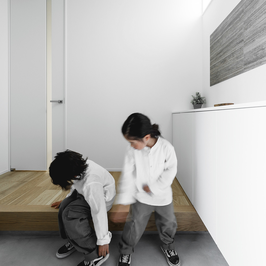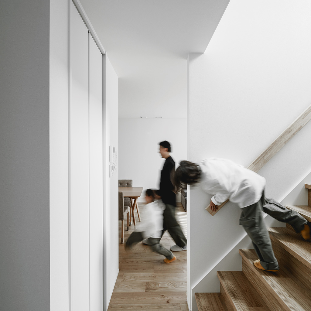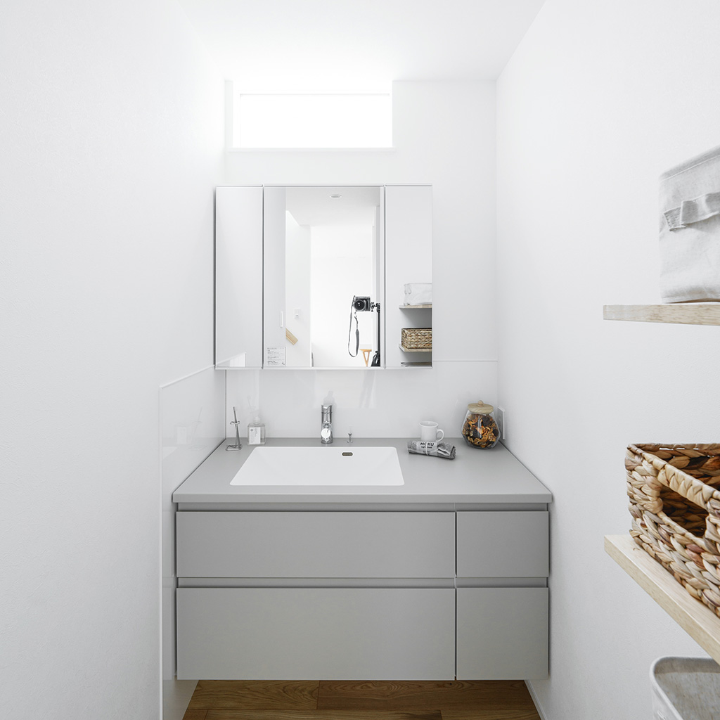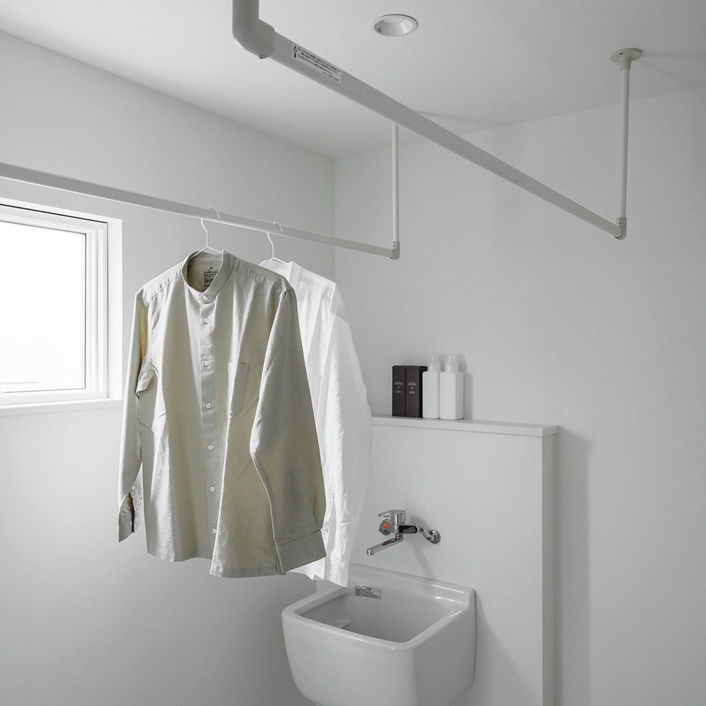 天候や季節を問わず快適に使えるランドリールーム。シンプルなホワイトで統一された室内に、天井吊りの物干しバーを2本設置。雨の日や花粉シーズンでも、毎日の“洗う・干す”をストレスフリーに変えます。