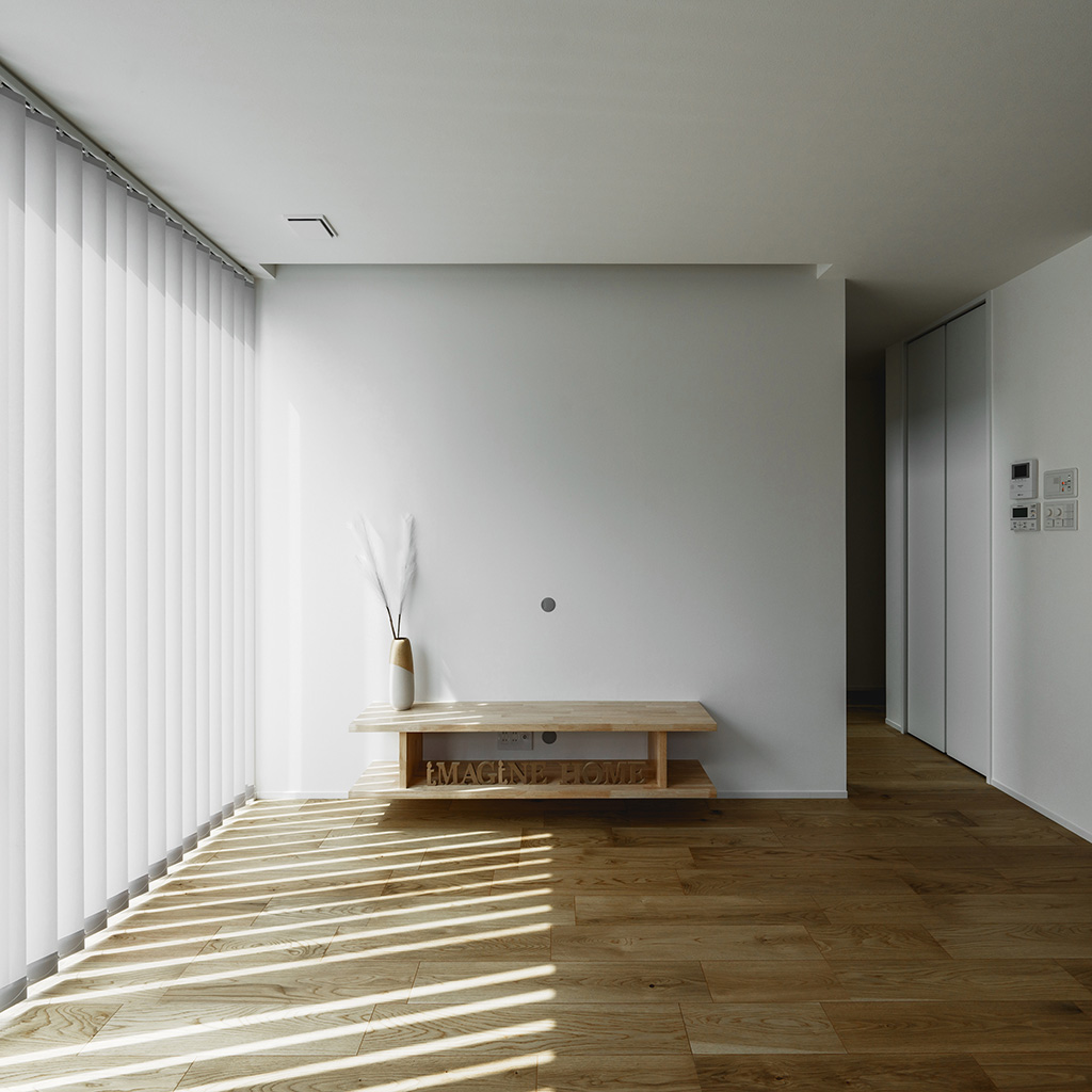 白を基調としたミニマルな空間に、無垢材のフローリングと家具がやさしいぬくもりを添えるリビングダイニング。大きな掃き出し窓から柔らかな陽光が降り注ぎ、調光可能な縦型ブラインドでプライバシーと開放感を自在にコントロール。ペンダントライトや間接照明が、夜のくつろぎタイムに温かな表情をプラスします。